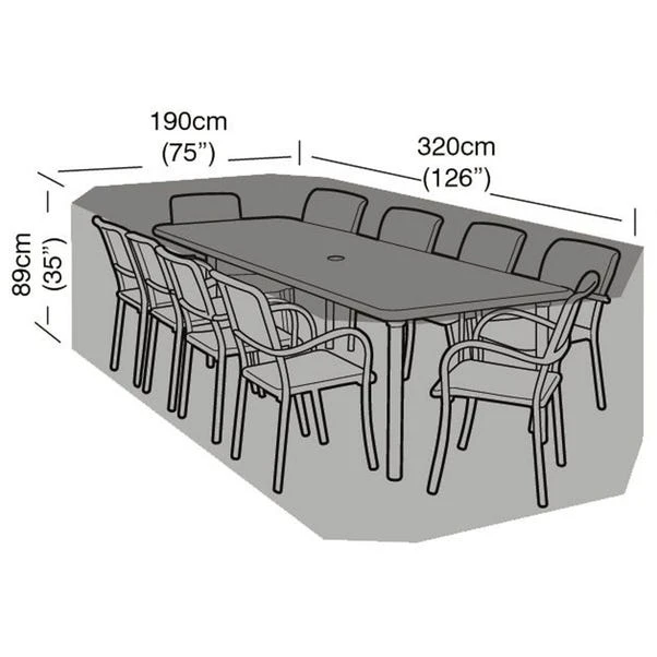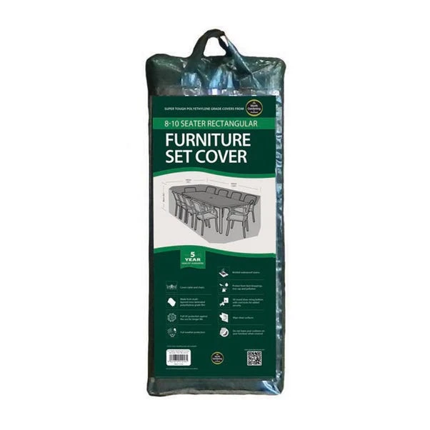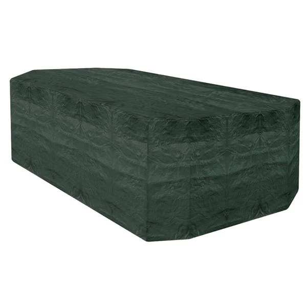 This Garland 8 and 10 Seater Rectangular Furniture Set Cover in Green is made from strong woven polyethylene material so it will provide full UV protection for your table and chairs against the sun for longer life. This cover will provide full weather protection with its waterproof taped seams and all-around airflow vent for reduced condensation. Protect your furniture from bird droppings, tree sap, and pollution with the wipe-clean surfaces and all-round drawstring bottom with cord locks for added security.