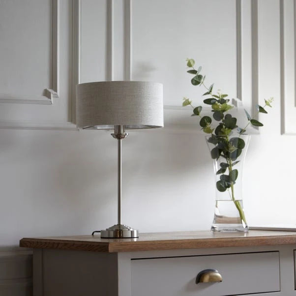 Achieve a timeless elegance with our Sandringham table lamp, a perfect blend of classic design and modern functionality. The brushed chrome finish metalwork harmoniously complements the single natural linen shade, creating a sophisticated and refined look. The matching metallic inner adds an extra layer of detail, enhancing the overall aesthetic. Ideal for those who appreciate classic aesthetics, this table light is the epitome of understated charm. The in-line switch provides convenience and ease of use.