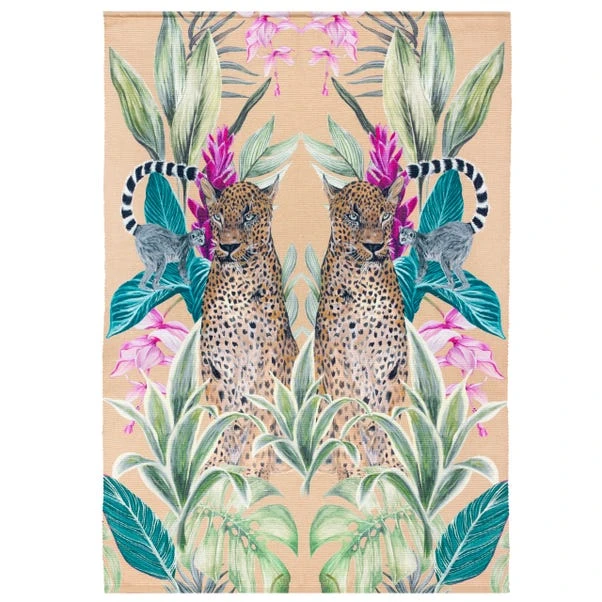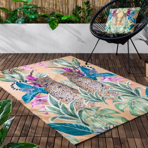 Elevate your space with the bold and exotic Wylder Kali Leopards Rug. Showcasing striking hand-painted leopards surrounded by dense jungle foliage, this digitally printed design brings a dramatic yet stylish touch to any setting. Made from durable, weatherproof, and UV-resistant polyester, it’s perfect for both indoor and outdoor spaces. Its lightweight and foldable nature makes it easy to transport, ensuring effortless versatility.